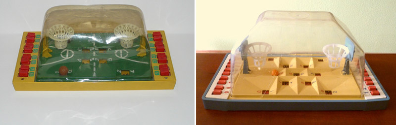 Ещё одна поппулярная советская настольная игра, имеющая заграничный прототип. На фото справа — советский настольный "Баскетбол", на фото слева — его западный аналог. Игры чуть отличаются дизайном, но принцип абсолютно одинаковый.