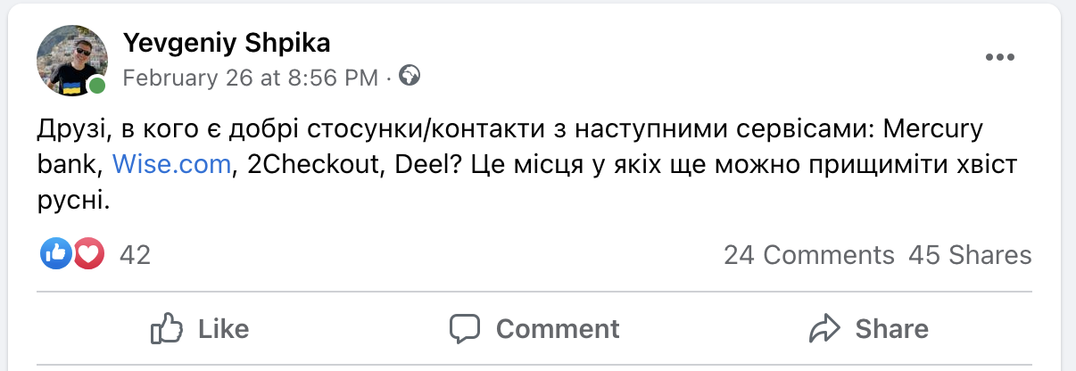привет. Мы с тобой состоим в куче чатиков, по-моему даже когда-то виделись на какой-то конфе. Есть информация, которая, возможно будет интересна вам в xxxx.В общем, я тут давним давно в одном россійском стартаперском чатіке. До ніх начінает доходіть что проісходіт, но єто все довольно медленно. Поскольку куча рос банков попали под санкции они пытаются найти пути спасения, и один из них — xxxx. Я думаю, xxxx не лишнием будет об этом знать. Также, в списке nnnn, yyyyy и еще zzzzz. Любая реакция от этих сервисов в сторону фаундеров с гражданством РФ поможет им быстрее осознать масштаб проблем которые происходят.но! главное чтобы наших не зацепило! Я знаю что этими же сервисами пользуется куча украинских компанийПоєтому лучше доносіть єту інформацію тем с кем есть хорошій контакт