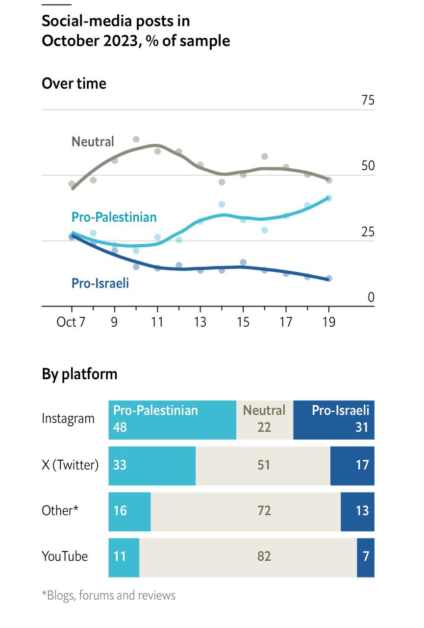 Я з перших днів звертав увагу, як палестинці накривали контентом соцмережі. Аналіз в журналі Економіст показує, що станом на 19 жовтня пости на підтримку Палестини в 3,9 разів переважали пости на підтримку Ізраїля.