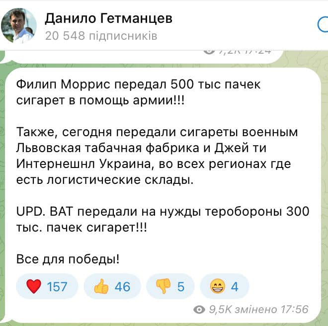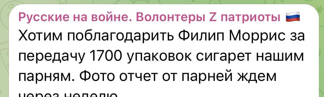 Я намагався знайти хоч якийсь позитив — чому спонсор вбивства українців має працювати в Україні. Кілька місяців тому аналізував та публікував інформацію, як тютюновий гігант допомагає ЗСУ. Все що я знайшов — це повідомлення одіозного Данила Гетьнцева, що у 2022 році американська тютюнова компанія Philip Morris передала українській армії 500 тис. пачок цигарок. Тоді цей «щипач гусей» та екс-помічник нардепа-зрадника Володимира Сивковича пафосно та двозначно написав російською «Все для победы!». Водночас, на російських пабліках можна знайти інформацію, що Philip Morris також балував цигарками окупантів. Точної цифри немає. Але, я думаю, вона суттєво більша аніж на цьому скріншоті Z-пабліка.