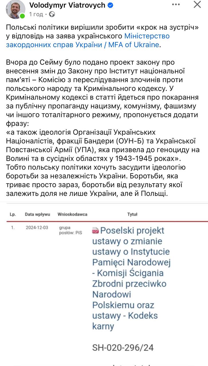Володимир Вʼятрович: Вчора до Сейму було подано проект закону про внесення змін до Закону про Інститут національної пам’яті – Комісію з переслідування злочинів проти польського народу та Кримінального кодексу. У Кримінальному кодексі в статті йдеться про покарання за публічну пропаганду нацизму, комунізму, фашизму чи іншого тоталітарного режиму, пропонується додати фразу: