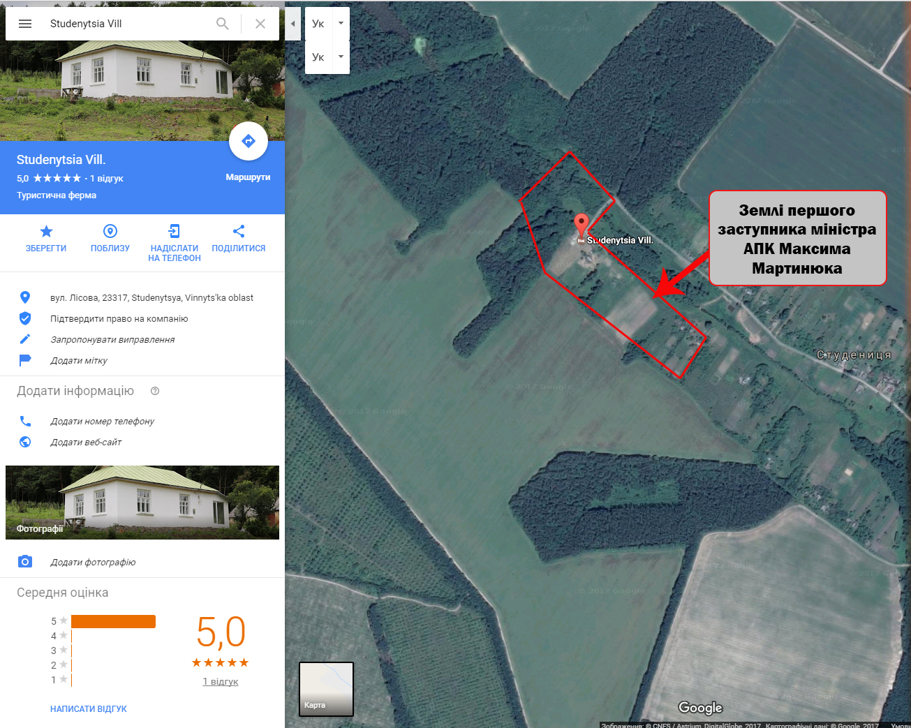 В целом электронная декларация чиновника сообщает, что он с семьей владеет не менее 11 земельными участками общей площадью 36 тыс. кв. м. Все участки расположены в Винницкой области, преимущественно в селе Студеница, население которого составляет менее 100 человек.