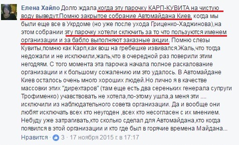 Схему, что произошло после того, как данный активист отжал сайт «Автомайдана» и группы организации в соцсетях, расписал в своей статье журналист Андрей Цокуренко. Во-первых, среди самих «автомайдановцев» Карп давно уже в черных списках. Во-вторых, последующие уличные акции, которыми он занялся, это не что иное, как мошенничество на доверии (примеры бизнеса, который кем-то оплачивается, читайте далее). В-третьих, после того как он «отжал» себе группу facebook AMKyiv и twitter с 55 тысячами подписчиков, он тут же объявил там сбор пожертвований. «Деньги поступали на счет специально открытой им общественной организации «Автомайдан Киев», а также подставного лица. Человек на чью карточку люди переводили средства просто снимал их и передавал Дмитрию. Сейчас этот сайт закрыт, но в поисковых системах сохранилась история и все реквизиты», - пишет журналист Цокуренко.
