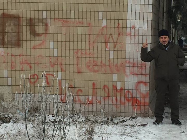 «Путин спаси жителей Геническа от Ислямова!» Одни жители это написали, другие утром затерли. Мы приехали уже к такому внешнему виду надписи . Подобные надписи появились и на вокзале. «Новоалексеевец - убей в себе укропа!», - написал он.