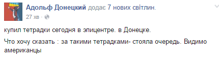 «Купил тетрадки сегодня в «Эпицентре». В Донецке. Что хочу сказать: за такими тетрадками – стояла очередь. Видимо американцы», - с иронией отметил Адольф Донецкий.