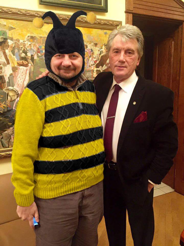 В интернете опубликовали фотоколлаж, на котором третий президент Украины Виктор Ющенко, известный своей любовью к пчеловодству, позирует рядом с народным депутатом Игорем Мосийчуком в наряде пчелы.