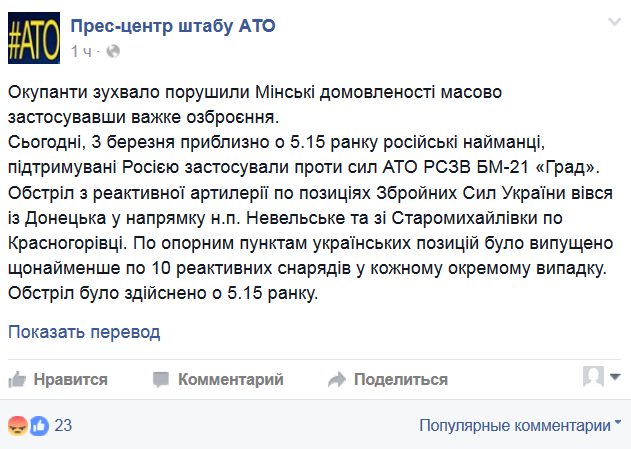 Террористы на Донбассе грубо нарушили минские договоренности, применив тяжелое вооружение. Об этом сообщают в пресс-центре штаба АТО.