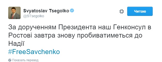 Кроме того, пресс-секретарь Порошенко Святослав Цеголко написал, что «по поручению президента наш генконсул в Ростове завтра снова будет пробиваться к Надежде Савченко».