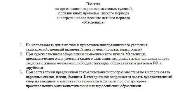 В памятке прописано, что использовать лопаты и вилы для приготовления блинов нельзя, а сжигаемое чучело Масленицы следует оформить в гендерно-нейтральном стиле, чтобы не вызывать ужас. Театрально-развлекательные представления для детей должны быть основаны на народных сказках, а не сделаны по мотивам западных комиксов, отметил депутат.
