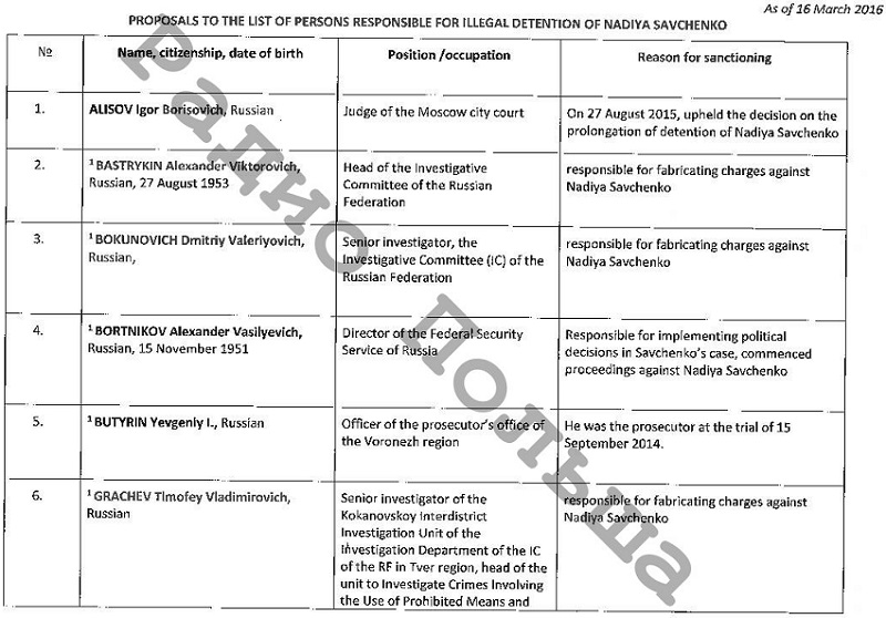 В так называемом «списке Савченко», который президент Украины Петр Порошенко 17 марта передал лидерам ЕС – главе Европарламента Мартину Шульцу и президенту Европейского совета Дональду Туску – нет фамилии президента РФ Владимира Путина.