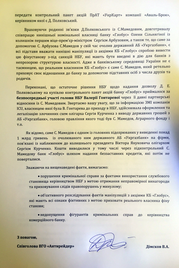 «Окончательное решение НБУ по поводу предоставления разрешения Д. Полковскому на покупку банка «Глобус» принималось при непосредственном участии главы НБУ Валерии Гонтаревой из-за своих давних партнерских отношений с С. Мамедовым. По информации СМИ, компания ICU, владельцем которой была В. Гонтарева до прихода в НБУ, осуществляла оформление и легализацию преступных схем Сергея Курченко по выводу государственных средств из АБ «Укргазбанк», главой правления которого был тогда С. Мамедов, Аграрного фонда и т.п.», — отмечается в обращении.