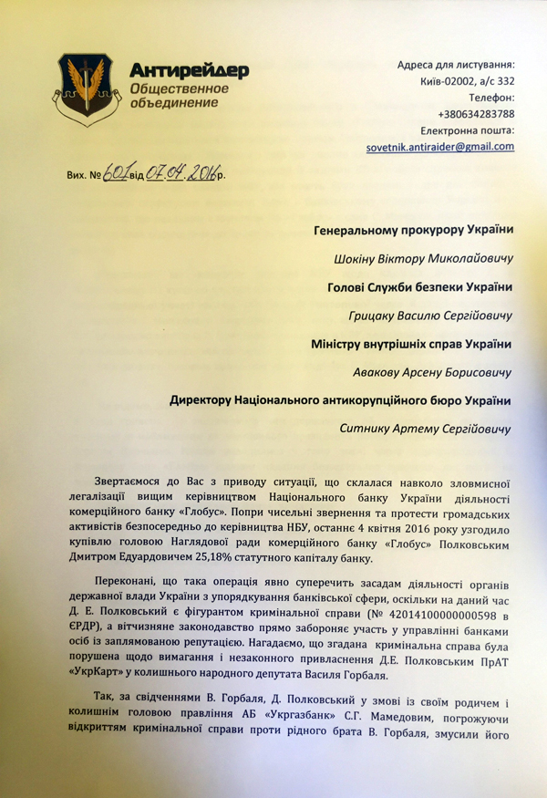 Об этом идет речь в обращении Всеукраинского общественного объединения «Антирейдер» к Генеральному прокурору, главе Службы безопасности Украины, министру внутренних дел и директору Национального антикоррупционного бюро. Копия обращения имеется в распоряжении редакции.