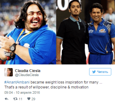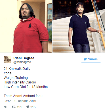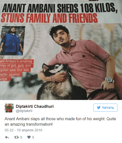 Своим похудением сын самого богатого человека в Индии (занимает 34-е место во всем мире по итогам Форбс) удивил всю страну. «Анант Амбани утёр нос всем, кто смеялся над его весом. Потрясающее преображение!», гласили комментарии интернет-пользователей и заголовки прессы. Пожалуй, он действительно заслуживает уважения.