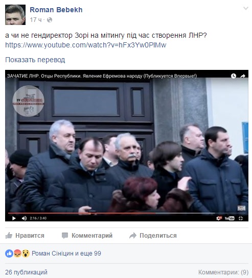 Генеральный директор футбольного клуба «Заря» Сергей Рафаилов присутствовал на сепаратистском митинге в Луганске во время создания так называемой ЛНР, на котором присутствовал задержанный бывший глава фракции «Партия регионов» в Верховной Раде Александр Ефремов.