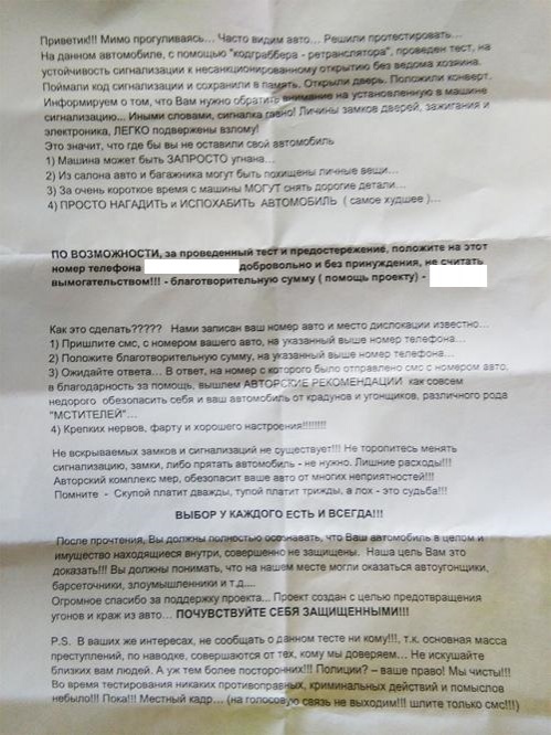 Потом машину закрывают. И автовладелец в недоумении получает это послание. Страх и переживание за авто заставляет дать требуемое злоумышленникам, при этом в этой схеме предъявить им просто нечего, к тому же злоумышленники не дают вам никаких гарантий. Возможно, через неделю с вас потребуют еще большую сумму.