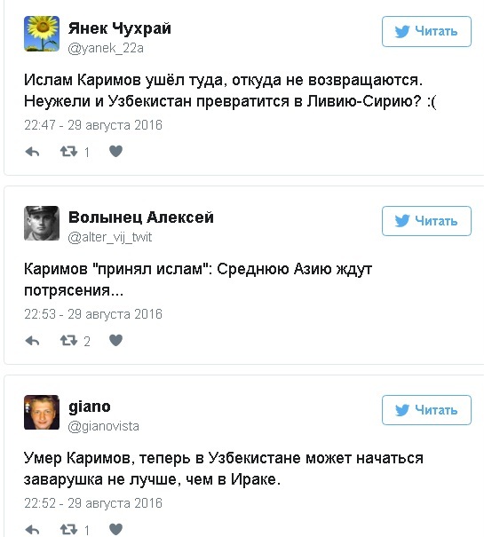 Пользователи соцсетей со страхом восприняли новость о кончине президента Узбекистана Ислама Каримова. Большинство из них отметили, что теперь страну ждут многочисленные потрясения. Многие посчитали, что смерть узбекского лидера приведет к росту экстремистских настроений и спровоцирует волну терроризма в регионе.