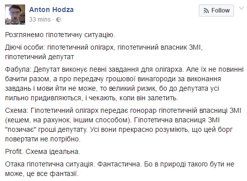 Ходза иронично предположил, что Лещенко выполняет определенные задачи для украинского олигарха, который через владелицу СМИ передает средства, которая «одалживает» его нардепу.