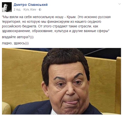 В Украине высмеяли заявление одиозного российского певца, депутата Госдумы РФ Иосифа Кобзона о том, что оккупированный Крым является для России «непосильной ношей».