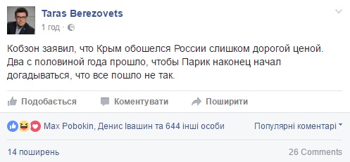 В частности, его слова прокомментировал на своей странице в Facebook политтехнолог Тарас Березовец, который сотрудничает с Администрацией президента Украины Петра Порошенко.