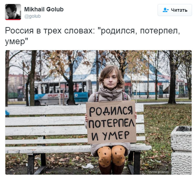 На фотографии изображена девушка, сидящая на скамейке. В руках у нее плакат с надписью: «Родился, потерпел и умер».