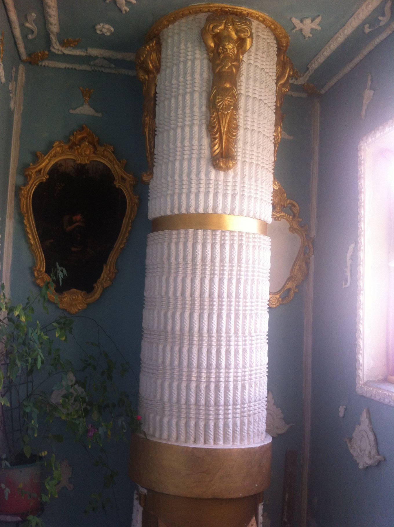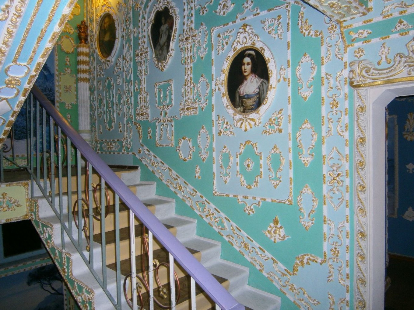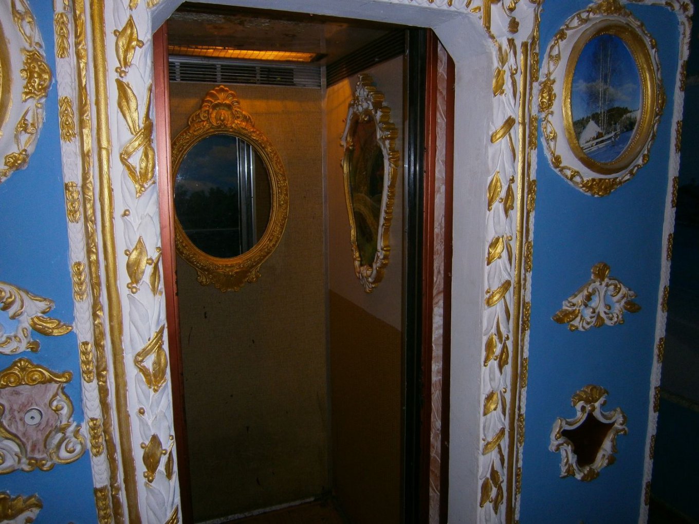 В Киеве на улице Радужной, 11-а, пенсионер Владимир Чайка превратил три лестничные площадки своей 9-этажки в настоящий музей! Стены вдоль лестницы он украсил чудесной лепниной с «позолотой» и портретами женщин из средневековья, а стены украсил фотообоями в виде панно с пальмами, лебедями и фонтанами. Теперь три этажа дома больше напоминают Версаль или Эрмитаж!