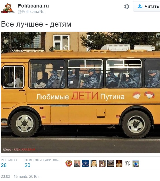 В социальных сетях посмеялись над фотографией российских сотрудников силовых ведомств в автобусе, в котором ранее, судя по надписи на боковой стороне, перевозили детей.