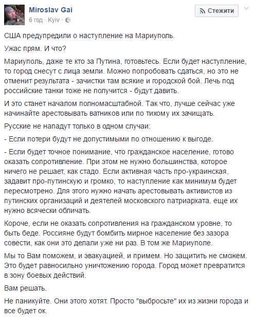 «Русские не нападут только в одном случаи: если потери будут не допустимыми по отношению к выгоде. Если будет точное понимание, что гражданское население готово оказать сопротивление», - написал Мирослав Гай.