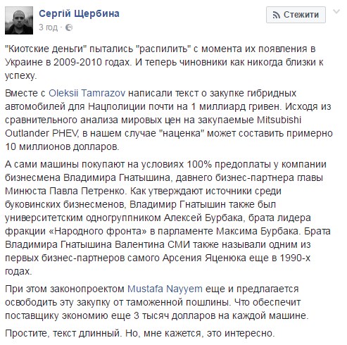 Он уточнил , что машины «покупают на условиях 100% предоплаты у компании бизнесмена Владимира Гнатышина, давнего бизнес-партнера главы Минюста Павла Петренко. Как утверждают источники среди буковинских бизнесменов, Владимир Гнатышин также был университетским одногруппником Алексей Бурбака, брата лидера фракции «Народного фронта» в парламенте Максима Бурбака. Брата Владимира Гнатышина Валентина СМИ также называли одним из первых бизнес-партнеров самого Арсения Яценюка еще в 1990-х годах».