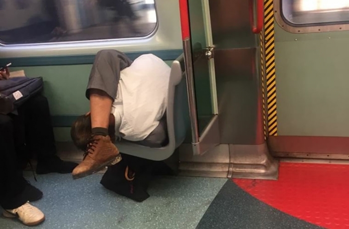 Впервые фотографии этого чудака появились в социальной сети Facebook, куда их выложил кто-то из пассажиров метро, а потом пошли гулять по интернету. На снимках изображен мужчина, который сидит перекрученный настолько, что не сразу можно рассмотреть, сколько у него ног и где его руки.