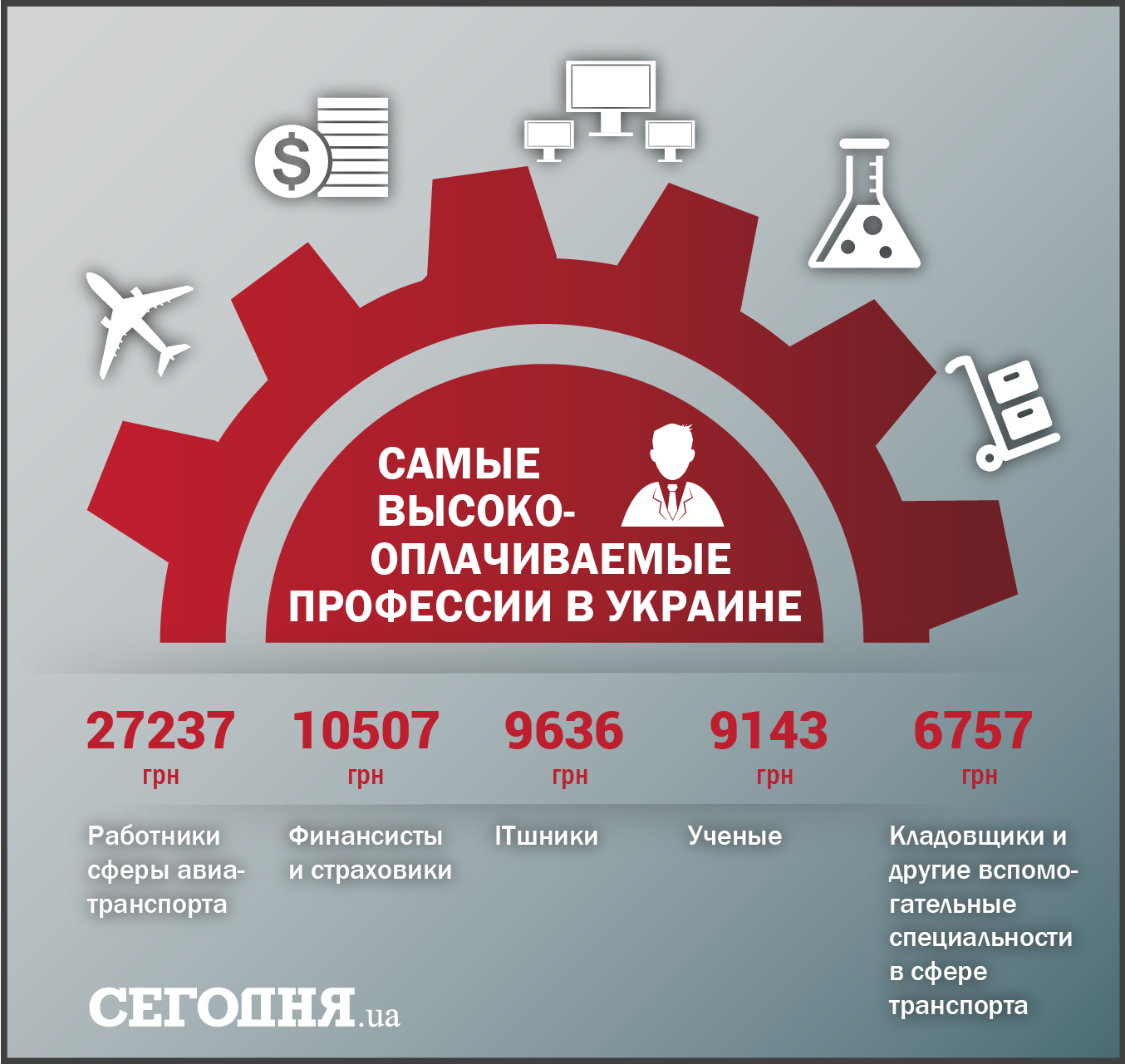 Согласно Государственной службе статистики, среди профессий традиционно первенство по уровню заработка занимают специальности в сфере авиационного транспорта – средняя зарплата 27 237 гривен. Зарплаты финансистов и страховиков поднялись до 10 507 гривен, в то время как IT-шники в Украине в среднем зарабатывают 9636 гривен.