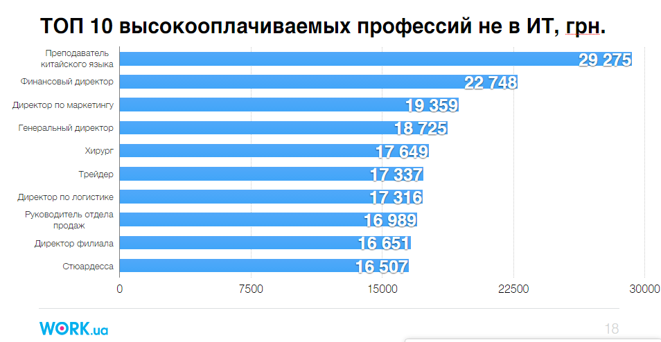 В то же время в рейтинге кадрового портала work.U на первом месте оказались преподаватели китайского языка (it-специальности не учитывались) со средней зарплатой больше 29 тысяч гривен. На втором месте финансовый директор (22,7 тысячи гривен). А замыкают десятку стюардессы со средней зарплатой 16,5 тысячи гривен.