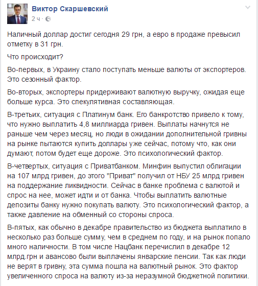 «В-третьих, ситуация с Платинум банк. Его банкротство привело к тому, что нужно выплатить 4,8 миллиарда гривен. Выплаты начнутся не раньше, чем через месяц, но люди в ожидании дополнительной гривны на рынке пытаются купить доллары уже сейчас, потому что, как они думают, потом будет еще дороже. Это психологический фактор», - добавляет экономист.