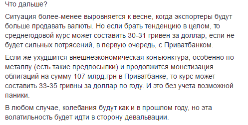«Но если брать тенденцию в целом, то среднегодовой курс может составить 30-31 гривен за доллар, если не будет сильных потрясений, в первую очередь, с «Приватбанком». Если же ухудшится внешнеэкономическая конъюнктура, особенно по металлу (есть такие предпосылки) и продолжится монетизация облигаций на сумму 107 млрд грн в «Приватбанке», то курс может составить 33-35 гривны за доллар по году. И это без учета возможной паники», - прогнозирует Скаршевский.