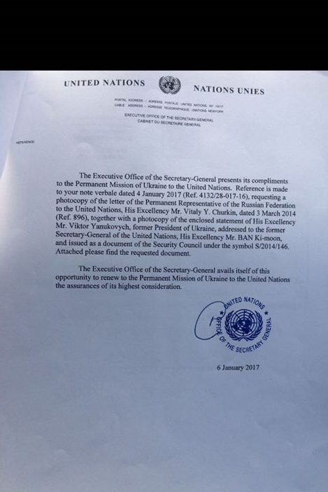 Таким документом располагает главная военная прокуратура, который предоставил секретариат ООН. В данном заявлении от 1 марта 2014 года Янукович обращается с просьбой к Российской Федерации ввести войска в Украину. Отмечается, что все вышеупомянутые документы, полученные следствием, уже официально подтверждены.