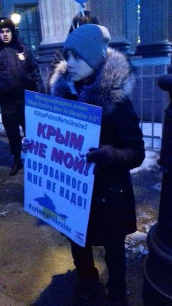 На снимке показана девушка с плакатом, на котором написано: «Крым не мой! Ворованного мне не надо!».