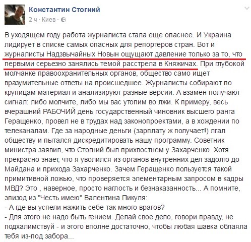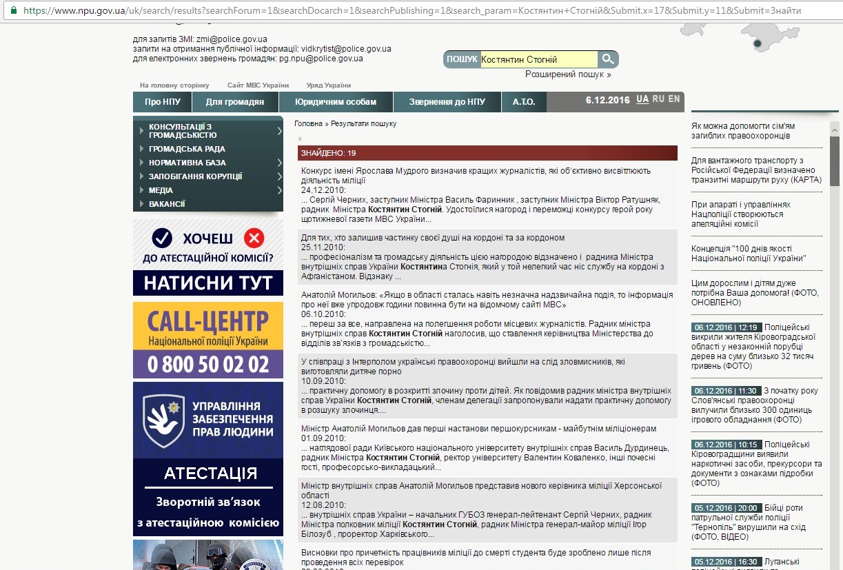 Однако эта информация не соответствует действительности, поскольку Стогний уволился из МВД еще задолго до событий Евромайдана. Это доказывает рапорт Константина Стогния об увольнении из органов внутренних дел. Ранее на сайте МВД, а ныне - Нацполиции, последние упоминания о журналисте в качестве советника министра внутренних дел датируются декабрем 2010 года. В свою очередь Виталий Захарченко занял должность главы МВД в ноябре 2011 года.