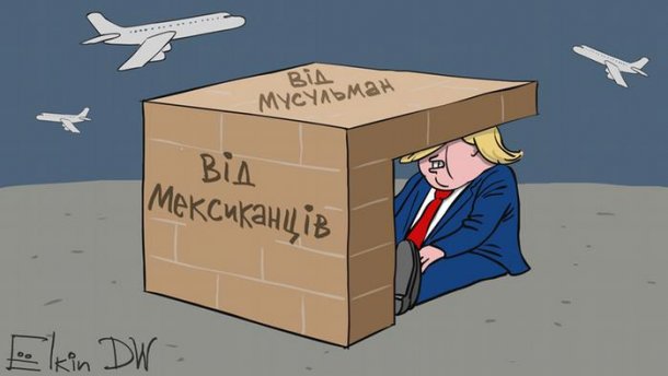 Напомним, не так давно Елкин публиковал карикатуру на нового президента США Дональда Трампа, которые огородился от всего мира стенами.