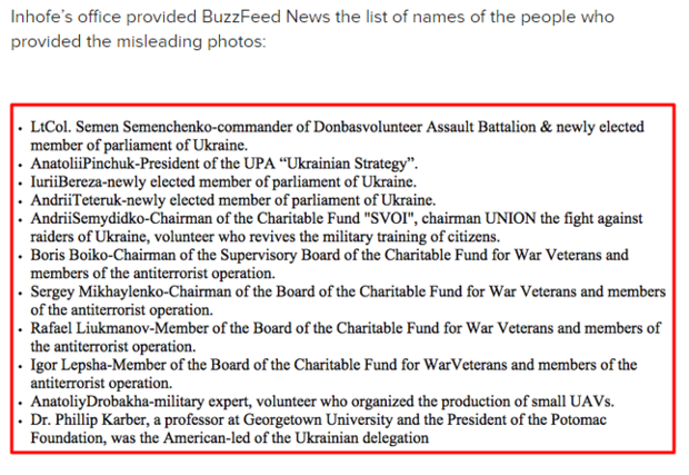 В состав делегации входили депутаты Верховной Рады, лидер военного формирования и профессор из Джорджтаунского университета Филипп Карбер, пишет издание. Гости передали сенаторам «фотофакты», утверждая, что там изображены российские военные на Донбассе. Позже подлинность этих фотографий была опровергнута.