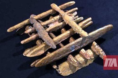 В трюме корабля было найдено 47 слитков загадочного металла красновато-золотистого оттенка. Ученые предполагают, что это может быть орихалк – редкий сплав из легендарной Атлантиды. В целом, это был бы обычный корабль, если бы не эти слитки металла, который оказался сплавом меди (примерно 75-80%), цинка (15-20%) и небольшого количества примесей.