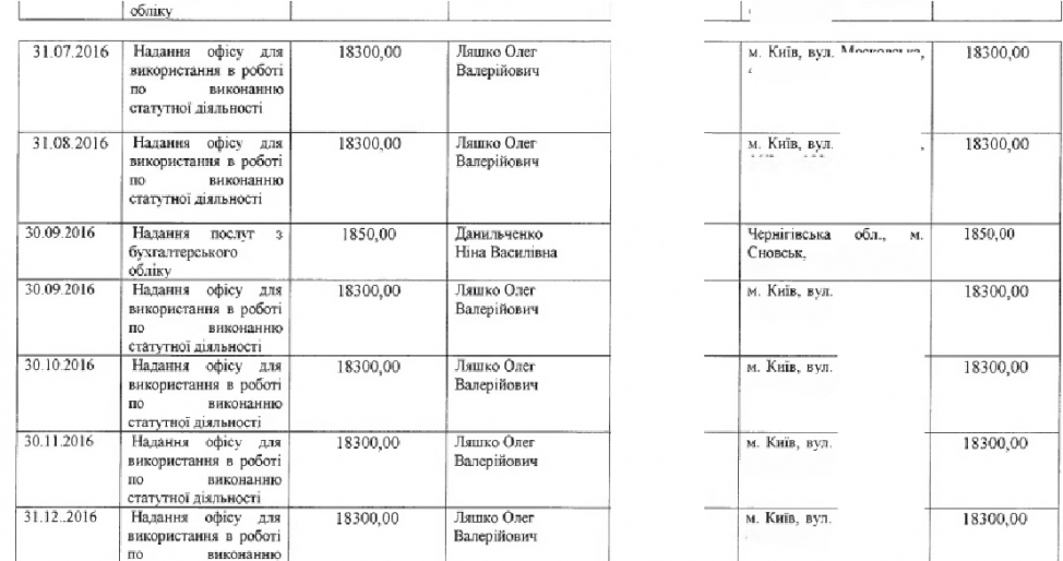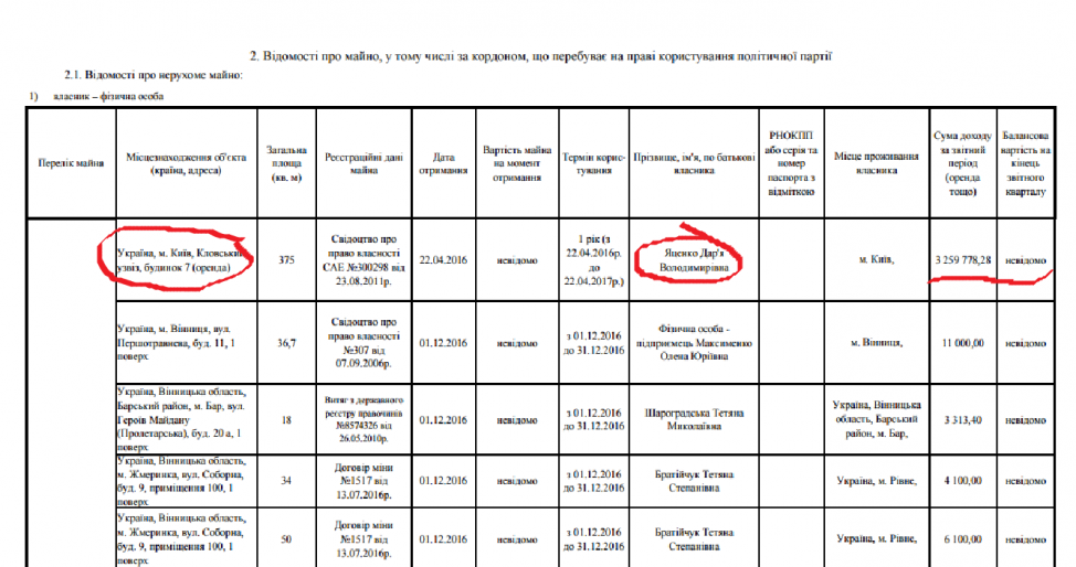 В то же время сама партия «Возрождение» располагается в апартаментах фирмы «Энерготранскомплект» и «Приватбанка» в Музейном переулке в Киеве. В отчете указано, что эти два владельца столичной недвижимости находятся в г. Днепр по ул. Набережная Победы, 50, где собственно и находится отделение «Приватбанка».