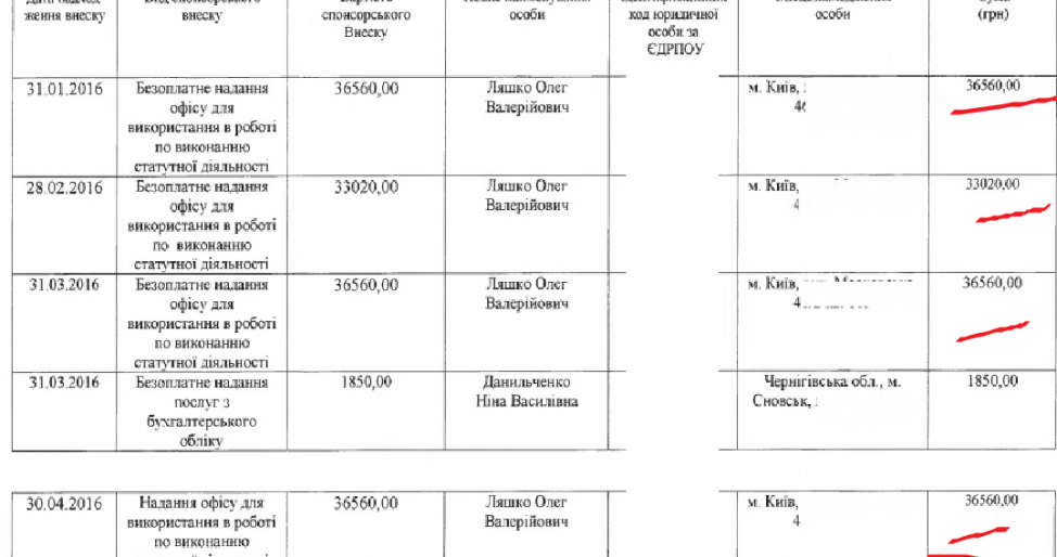Радикальная партия Олега Ляшко арендует офис на Кловском спуске, 7 у самого Олега Ляшко. Лидер партии пустил к себе коллег бесплатно. В отчете стоимость аренды оценена в 36 000 гривен на месяцы, что является спонсорским взносом Ляшко в партию. Еще один офис в том же здании партия снимает в ООО «Наутилус-Инвест 2006», которое связано с нардепом-радикалом Сергеем Рыбаком. За этот офис на 285 кв.м. радикалы заплатили 2 миллиона гривен. Руководителем «Наутилус-Инвест» до недавнего времени был помощник Рыбака.