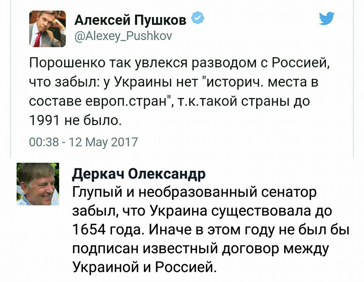 На что пользователь сети Александр Деркач резонно ответил: "Глупый и необразованный сенатор забыл, что Украина существовала до 1654 года. Иначе в этом году не был подписал известный договор между Украиной и Россией".