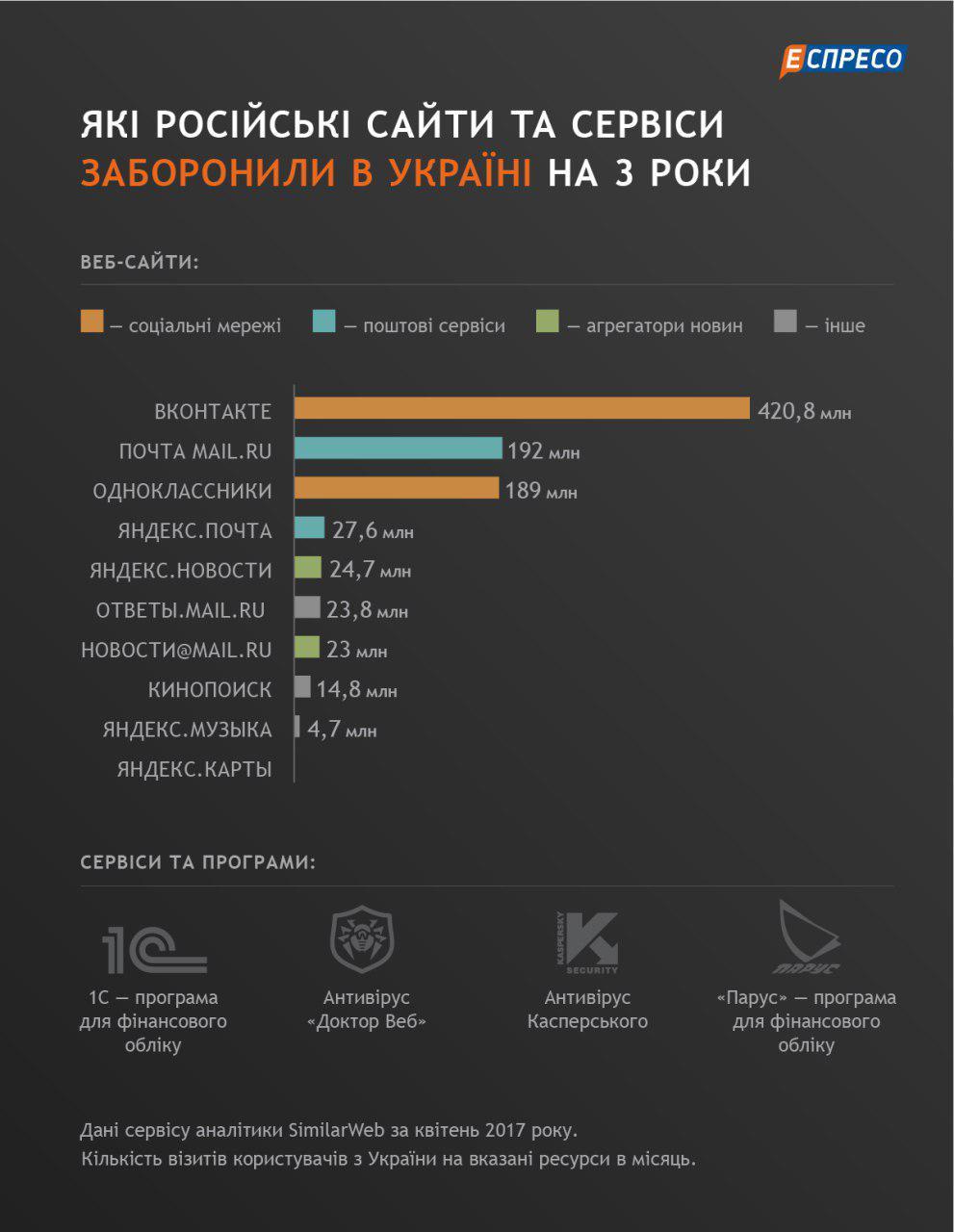 Стало известно, сколько украинцев пользуются запрещенными «Вконтакте», «Одноклассники» и «Яндекс» (Инфографика)
