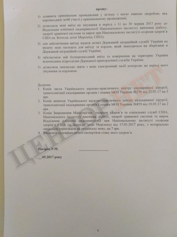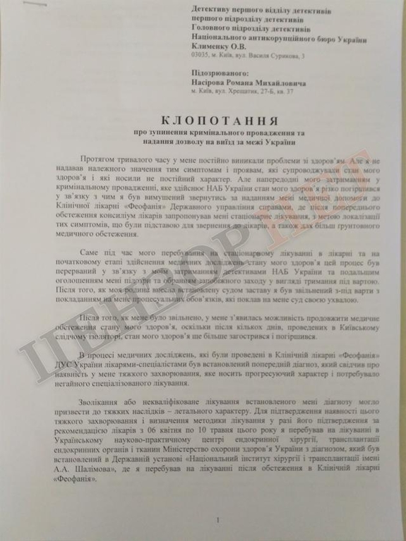 В частности Роман Насиров просил детектива первого отдела детективов первого подразделения детективов Главного подразделения детективов НАБУ Клименко приостановить криминальное производство, по которому отстраненному главе ГФС объявлено подозрение, разрешить ему выезд на лечение в период с 11 по 30 июня 2017 года в отделение клинической эндокринологии Национального института изучения диабета, болезней пищеварительной системы и почек (г. Бетесда, штат Мериленд), выдать ему загранпаспорт, временно снять с него электронный браслет и обеспечить беспрепятственный выезд с территории Украины.