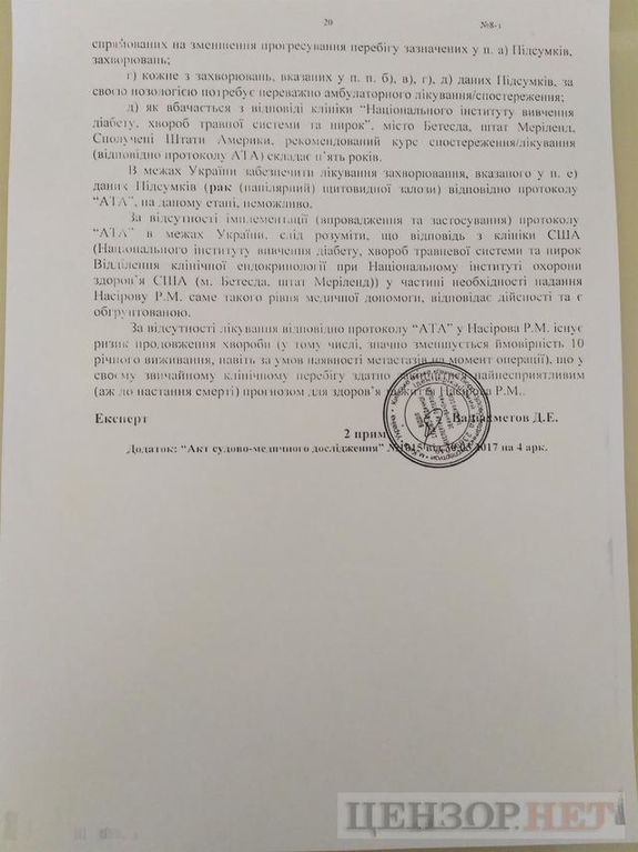 Именно для послеоперацинного лечения рака Насиров и просит разрешить ему выезд за границу, так как лечение по рекомендованному ему протоколу «АТА» в Украине не возможно.