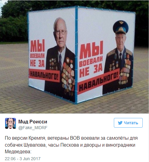 "По версии Кремля, ветераны ВОВ воевали за самолёты для собачек Шувалова, часы Пескова и дворцы и виноградники Медведева", - говорится в подписи к фото.