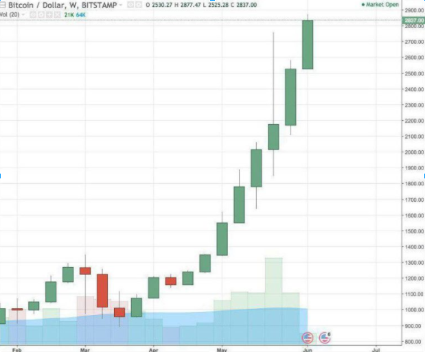 И это не просто рост, обратите внимание, что зеленые свечи на графике ниже, которые показывают еженедельный рост цены, даже не зарегистрировали отката цены с $2700 до $1850, которое произошло 25-го мая.