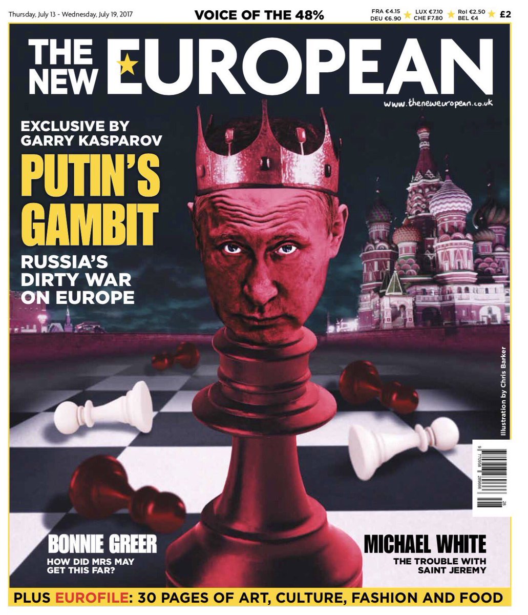 «Эксклюзив от Гарри Каспарова. Путинский гамбит. Российская грязная война против Европы», - говорится на обложке.