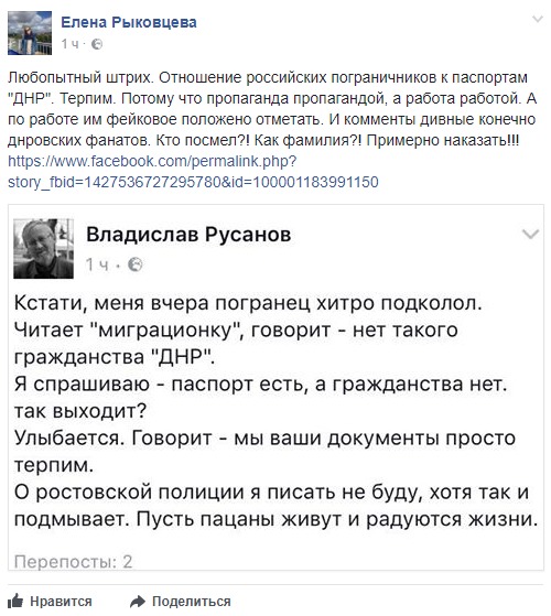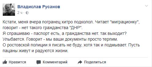 На показательный случай обратила внимание журналистка Елена Рыковцева. На своей странице в Facebook она опубликовала скриншот записи "председателя правления союза писателей ДНР" Владислава Русанова. Мужчина жаловался на пограничника, указавшего, что "гражданства ДНР" не существует.