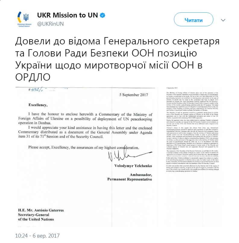 Постоянное представительство Украины в ООН официально изложило позицию Киева по введению на Донбасс миротворческого контингента генсеку ООН и председателю Совбеза организации. Об этом говорится в сообщении на странице постпредства Украины в ООН в Twitter.